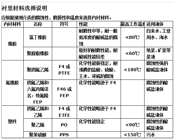 3、被測(cè)介質(zhì)溫度:普通橡膠襯里:-20—+60℃;高溫橡膠襯里:-20—+90℃ 聚四氟乙稀襯里:-30—+100℃;高溫型四氟襯里:-30—+180℃